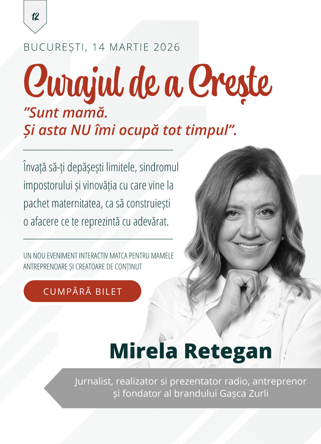 La MATCA Meets, alături de Mirela Retegan, jurnalist și antreprenor, fondatoarea Gasca Zurli, vei explora cum arată cu adevărat drumul de la nesiguranță la construcție solidă. Vei înțelege ce decizii contează când resursele sunt limitate, cum să-ți asumi ambiția fără vinovăție și cum să creezi un business care crește odată cu tine și familia ta.