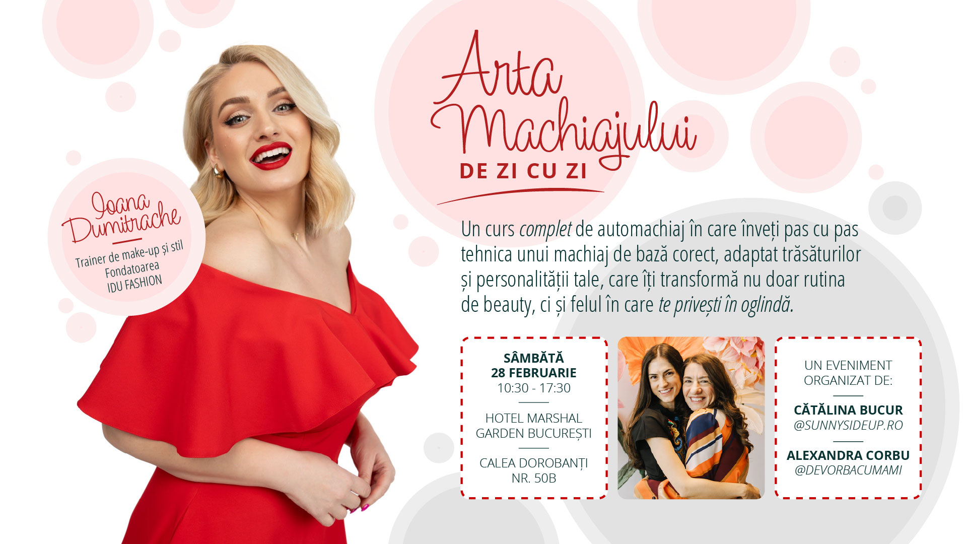 Ioana Dumitrache te va ghida pas cu pas prin exerciții practice, explicații clare și aplicabile imediat, ajutându-te să îți înțelegi trăsăturile, să alegi produsele potrivite pentru tine și să stăpânești tehnica unui machiaj de bază realizat corect. Vei lucra direct pe chipul tău, vei primi recomandări personalizate și vei pleca nu doar cu informații, ci cu certitudinea că știi exact ce ai de făcut atunci când te așezi în fața oglinzii. Iar diferența nu se va vedea doar în machiajul tău, ci și în încrederea pe care vei începe s-o ai în propria frumusețe, zi de zi.